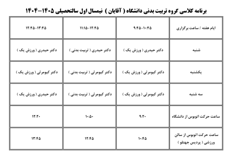 ساعت حرکت سرویس های دانشجویی گروه تربیت بدنی (آقایان)