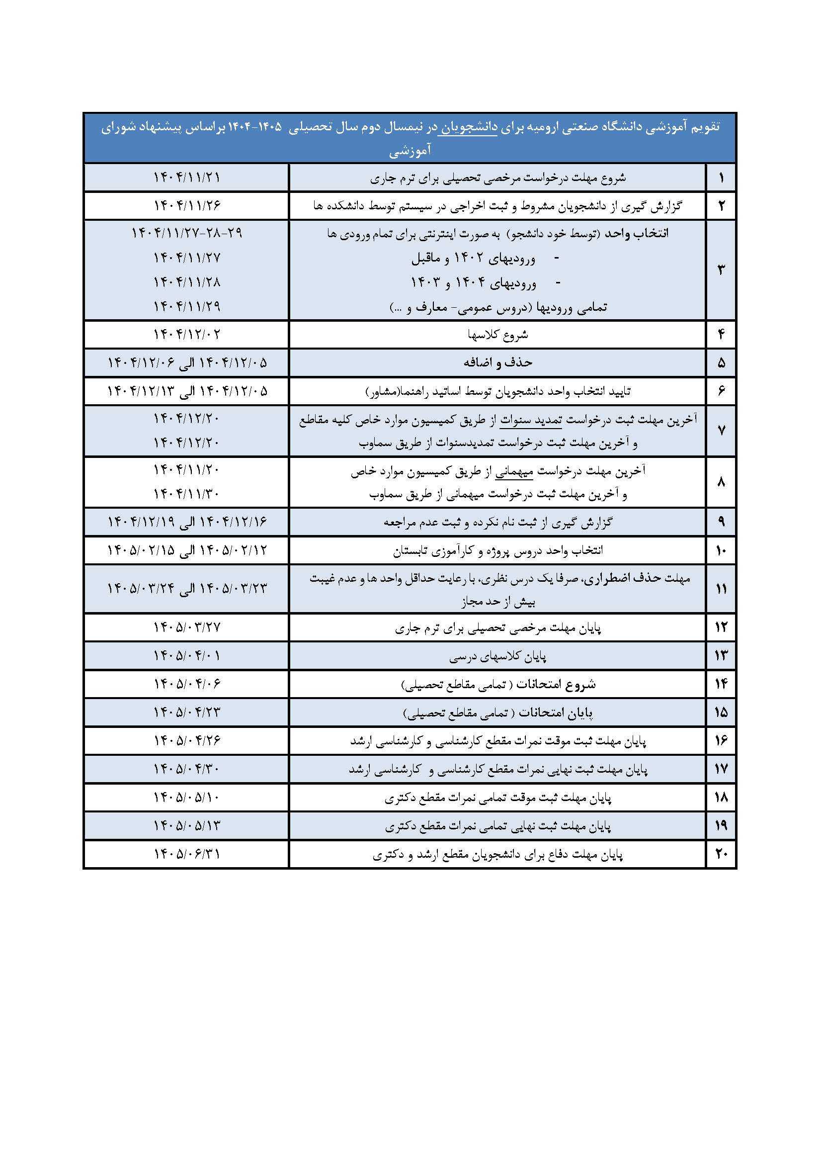 تقویم آموزشی دانشگاه صنعتی ارومیه برای دانشجویان در نیمسال دوم سال تحصیلی 1405 - 1404 براساس پیشنهاد شورای آموزشی و مصوب شده در هیات رئیسه دانشگاه