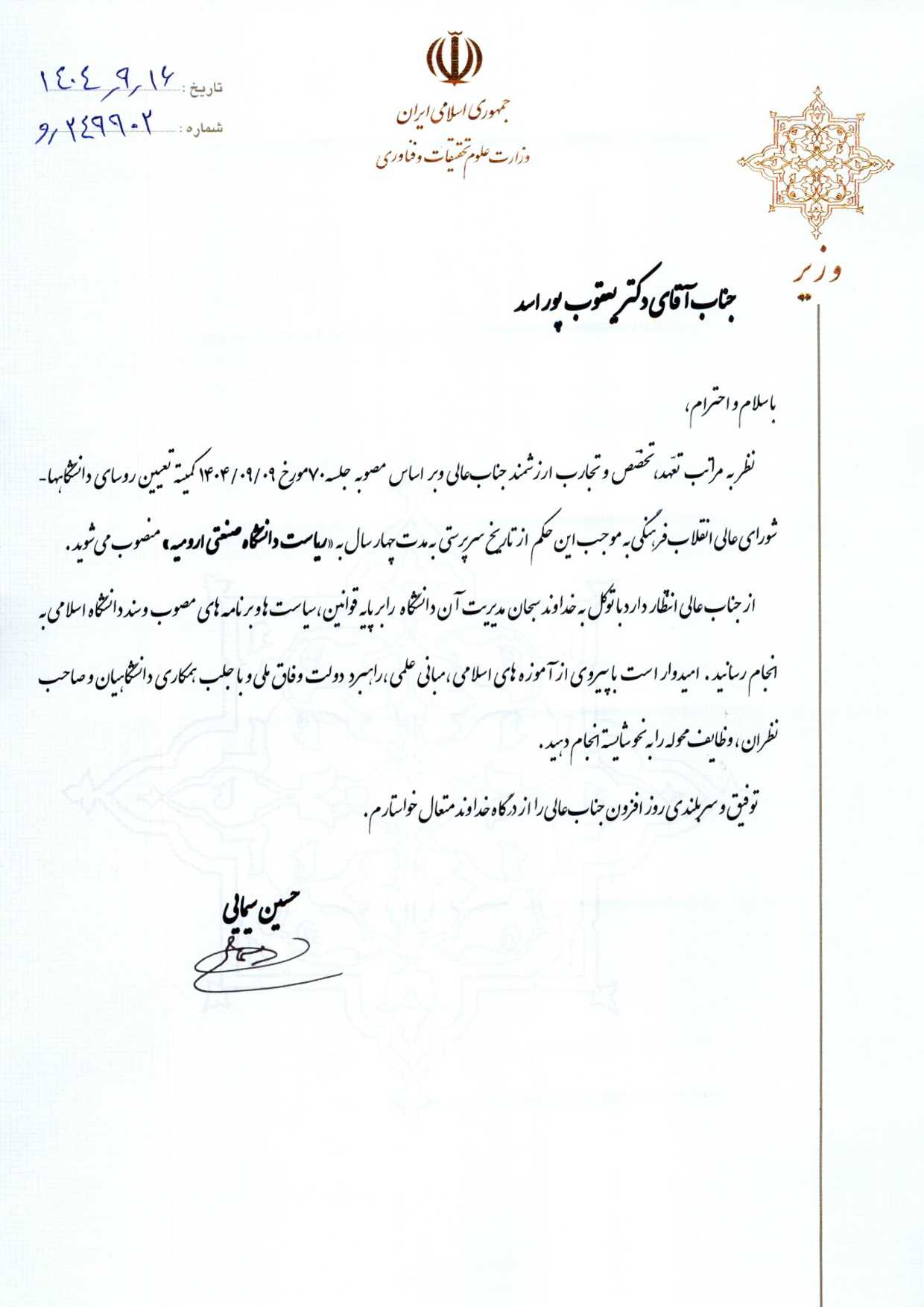 «نظر به مراتب تعهد، تخصص و تجارب ارزشمند جنابعالی و بر اساس مصوبه مورخ ۱۴۰۴/۰۹/۰۹ کمیته تعیین رؤسای دانشگاههای شورای عالی انقلاب فرهنگی، به موجب این حکم از تاریخ سرپرستی به مدت چهار سال به ریاست دانشگاه صنعتی ارومیه منصوب میشوید.