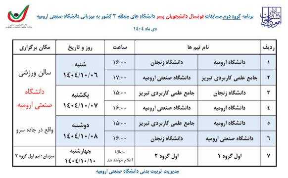 به گزارش روابط عمومی دانشگاه صنعتی ارومیه؛ در جلسهای که روز سهشنبه دوم دیماه ۱۴۰۴ با حضور مدیران تربیت بدنی دانشگاههای منطقه ۳ کشور و نماینده دبیرخانه منطقه ۳ ، در دانشگاه صنعتی ارومیه برگزار شد، مقرر گردید که مرحله نیمهنهایی مسابقات فوتسال دانشجویان دانشگاههای منطقه ۳ کشور به میزبانی دانشگاه صنعتی ارومیه برگزار شود. این مسابقات، مرحله انتخابی المپیاد فرهنگی ورزشی قهرمانی دانشجویان کشور است.